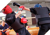 - Бойцы спаррингуют в защитной экипировке: шлем с решеткой, противоударный жилет, защита на пах, накладки на ноги, антинокаутные перчатки, – таким образом лицо и внутренние органы надежно защищены.